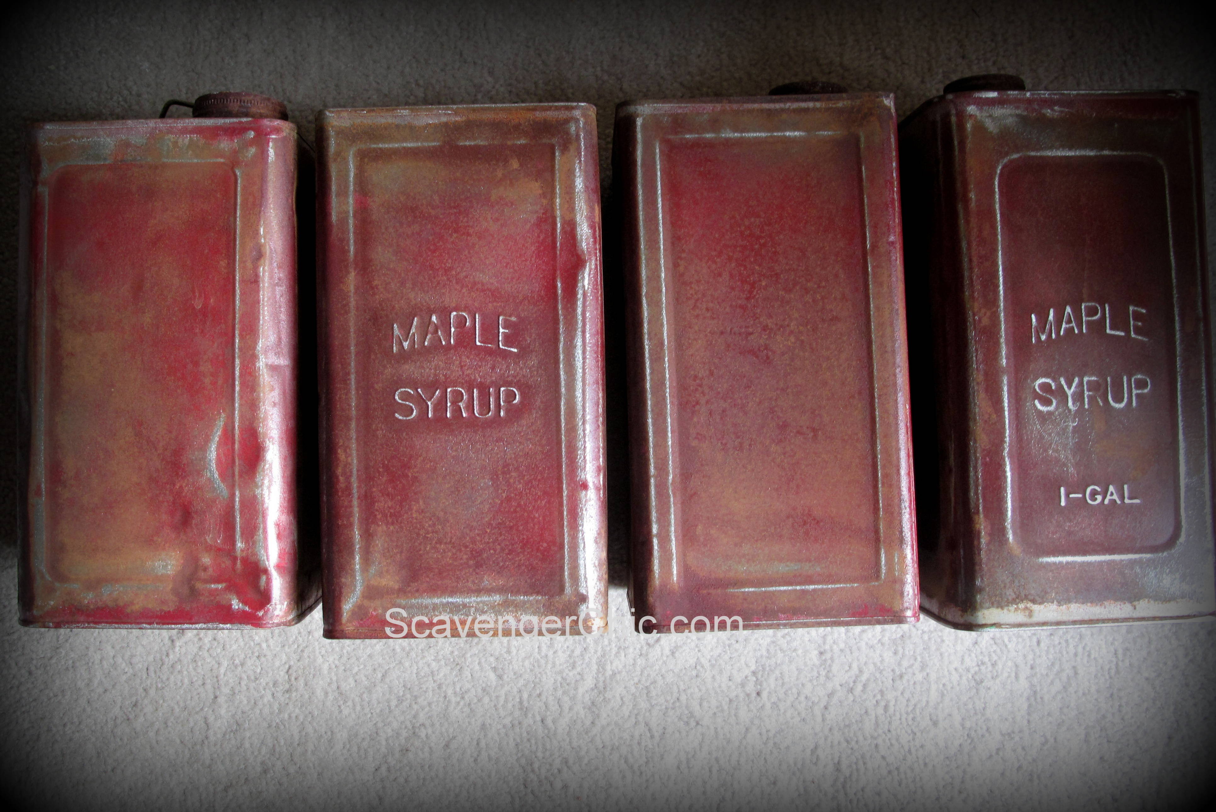 I then took my handy palm sander and gave the whole can a quick sand. To my surprise “maple syrup” appeared on two of the cans. It really was not noticeable before with all the rust. I thought they were paint thinner cans. Who knew?