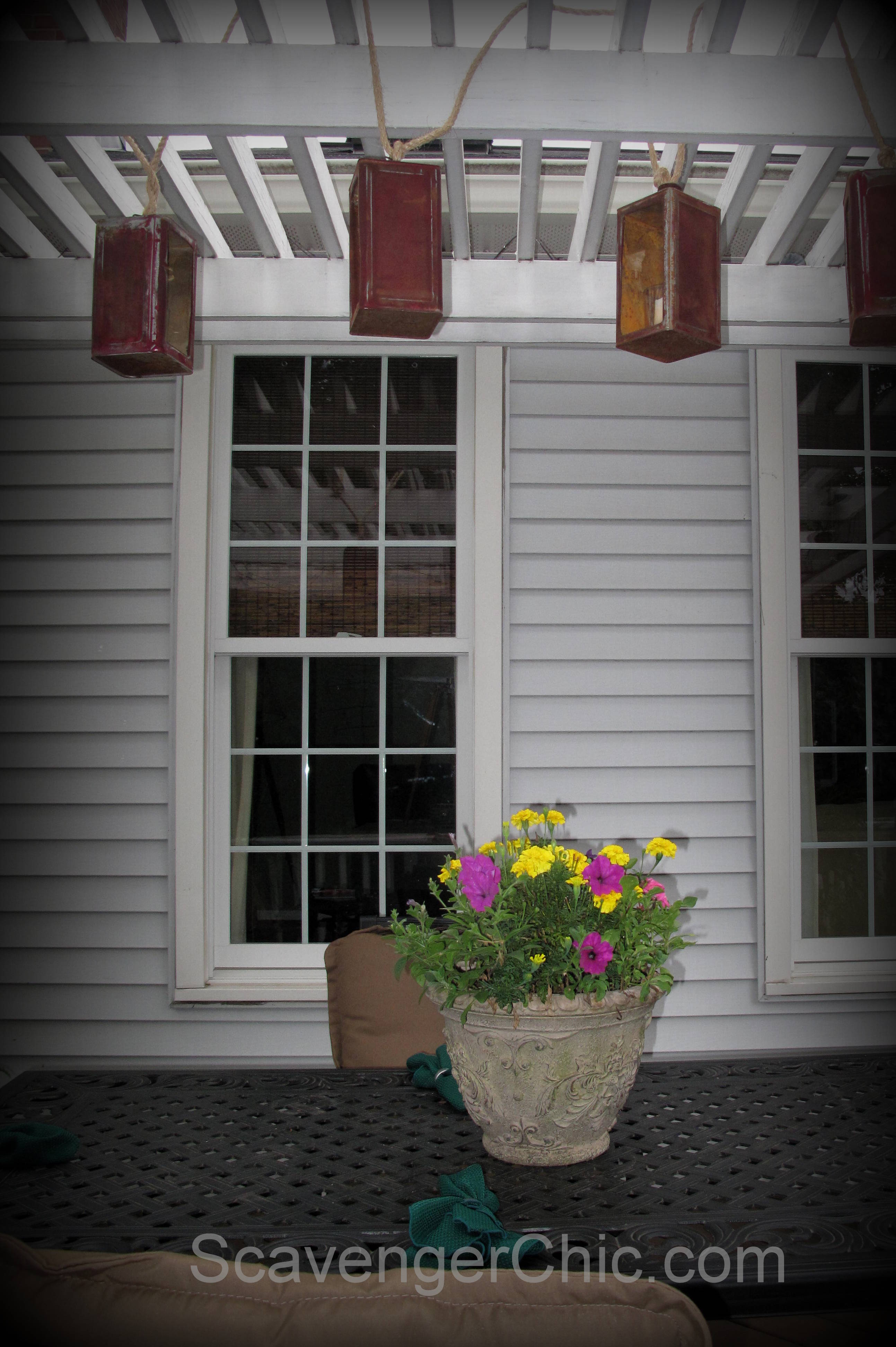 First tried hanging one of the lanterns on my bird feeder pole. Not too bad, but I thought hanging them all together would make a bigger impact.