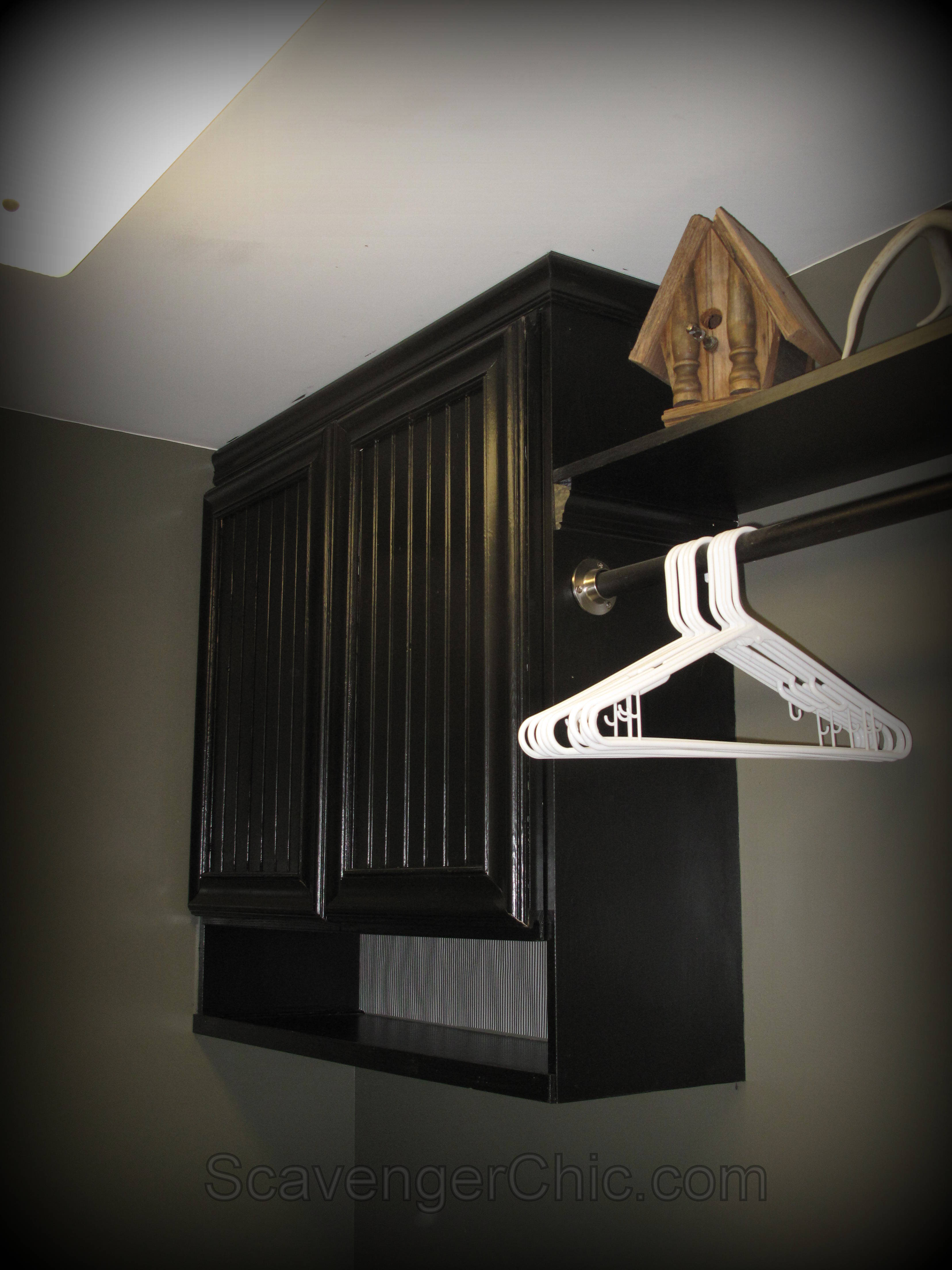 So we came up with a plan. The doors would get refaced with leftover wainscoting we had taken off our bedroom walls. The two cabinets would be lifted to the ceiling and installed in opposite corners with a hanging rod in between. A countertop would be installed over top of the washer and dryer and shelves built in under the cabinets. That thing to the right of the washer and dryer is where we currently have a trash can and tray tables, so they can stay for the moment and until I can find a nice looking laundry sink, the old one can stay.