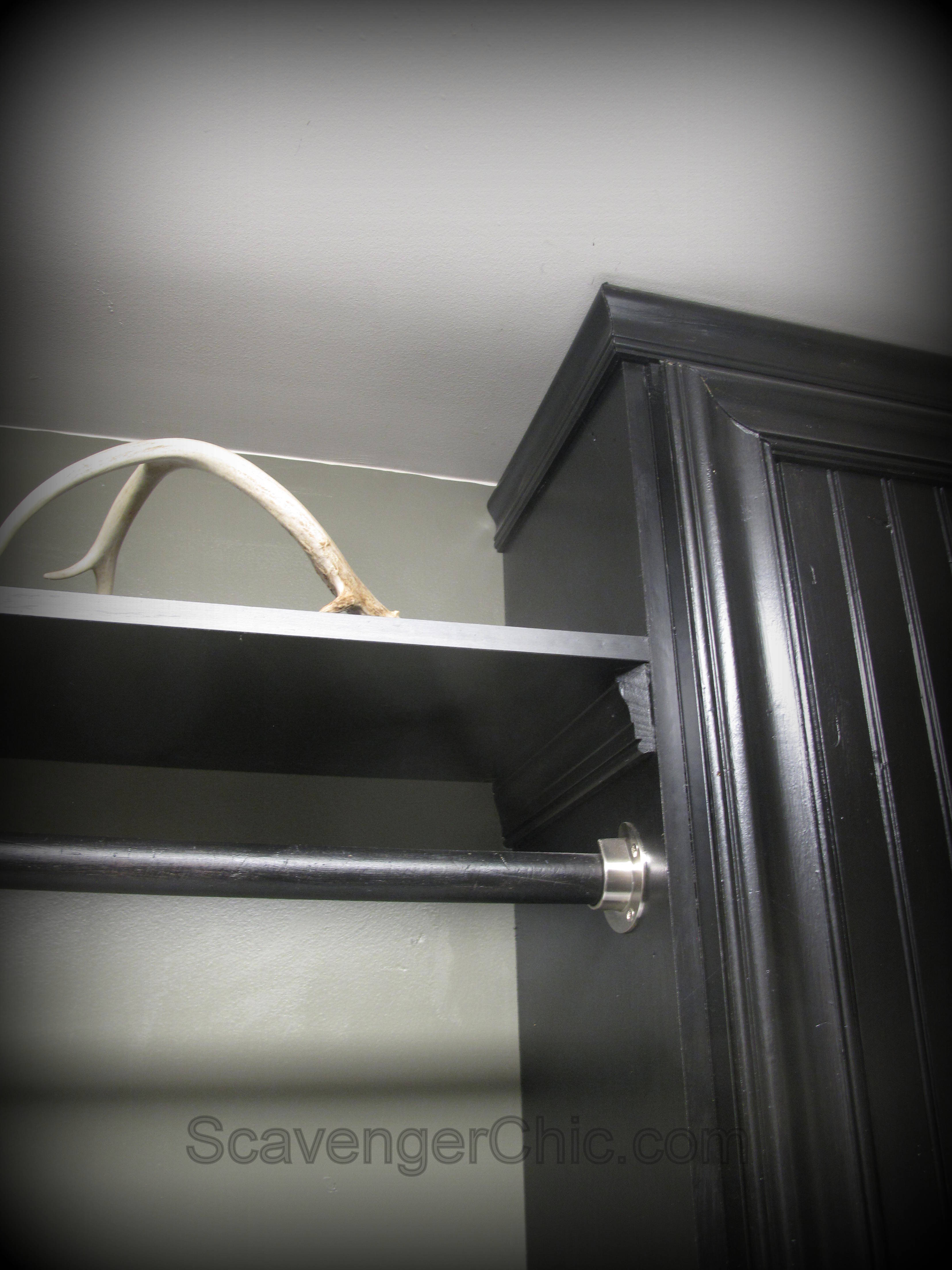 Plain boards were attached to the sides of the cabinets extending down 7 extra inches to allow for a shelf, An extra piece of molding was also attached to the side of the cabinet to allow a shelf to sit in between the cabinets.