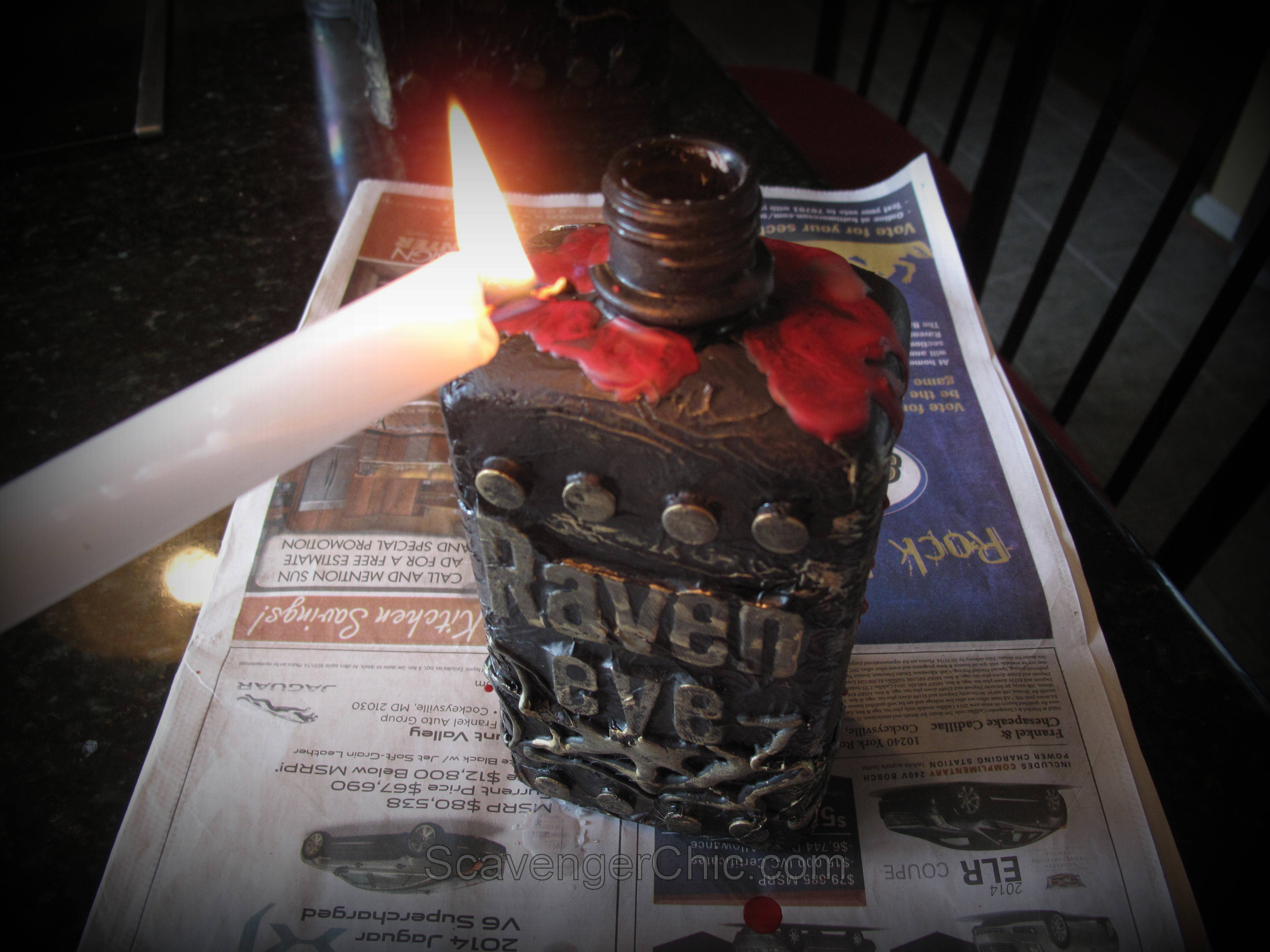 What’s Halloween without a little blood? This blood is red crayon melted and dripped on top and allowed to drip down the sides. Couldn”t really cover the neck too well without holding the bottle sideways, so ended up using hot glue around the neck and painted with red glossy paint. Now I had lots of ooey gooey blood.