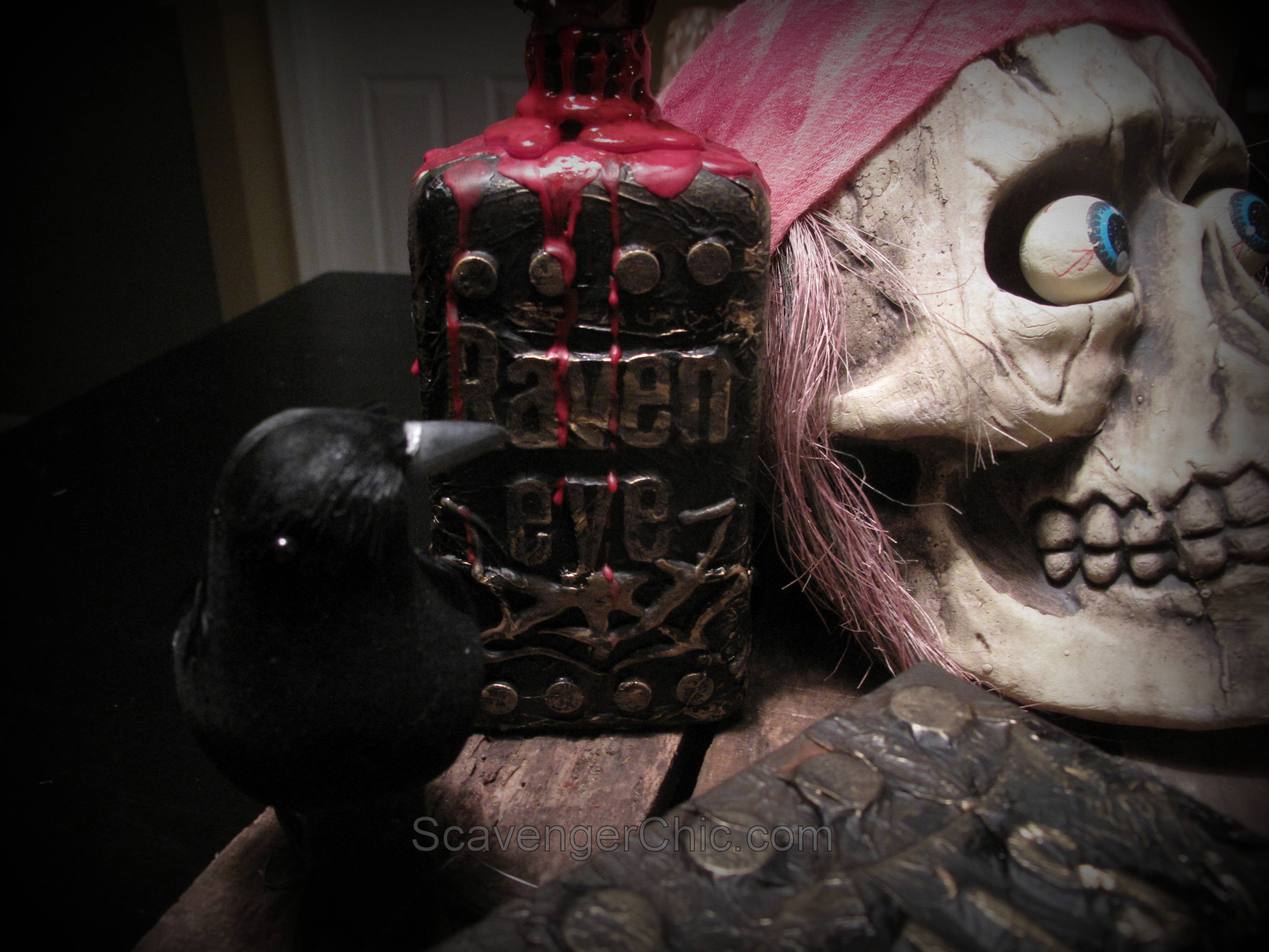 The Raven (crow) was from the dollar store, I believe he wants his eye back and you can find out how to put the pallet wood base together here.