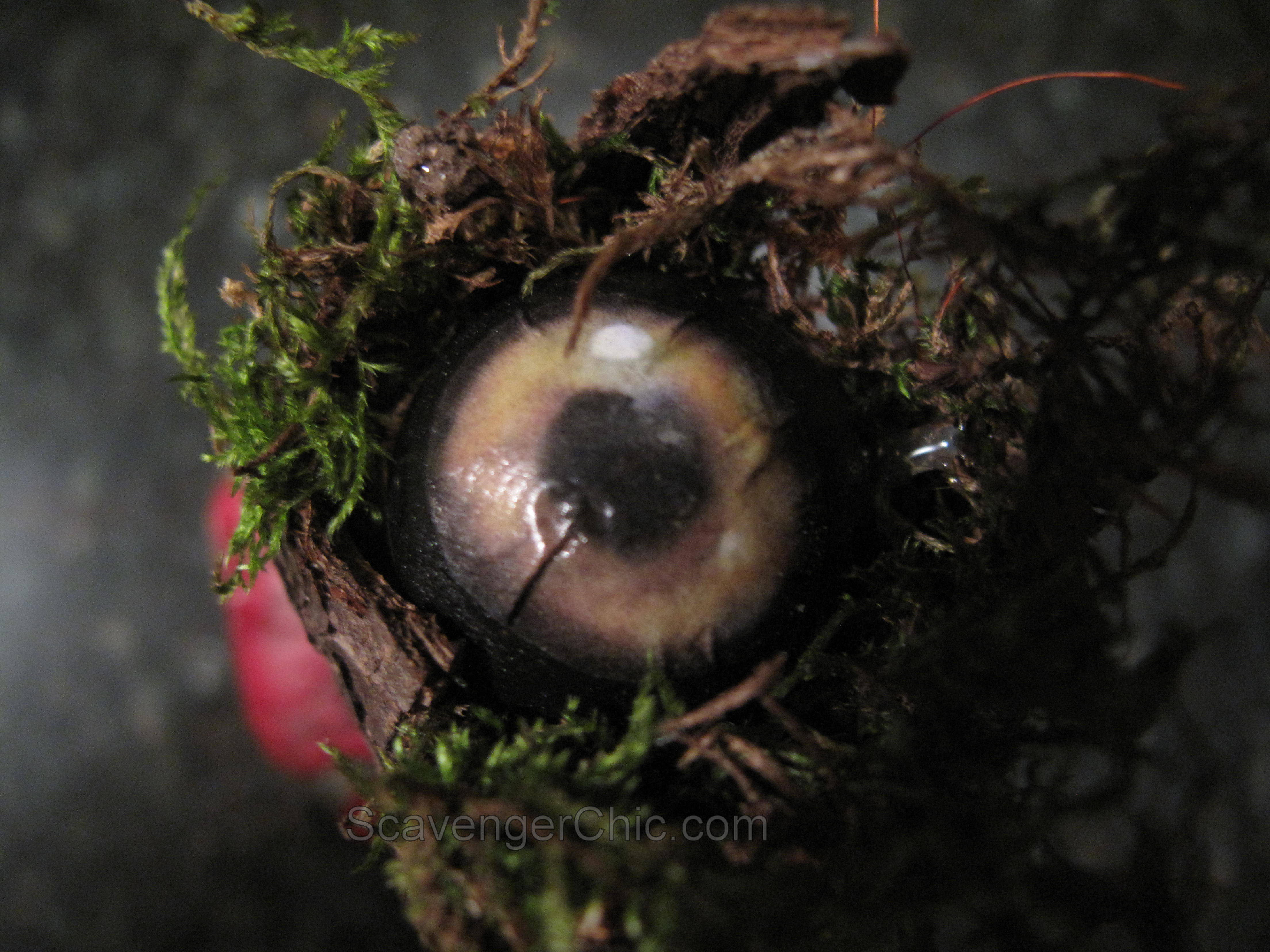 Now for the top. Any top this bottle once had was long gone. I had to improvise with a wine bottle cork. It was cut in half and tree bark was hot glued in place to cover the cork and high enough up to create a cup. Inside the cup I placed dried moss and my raven eye.