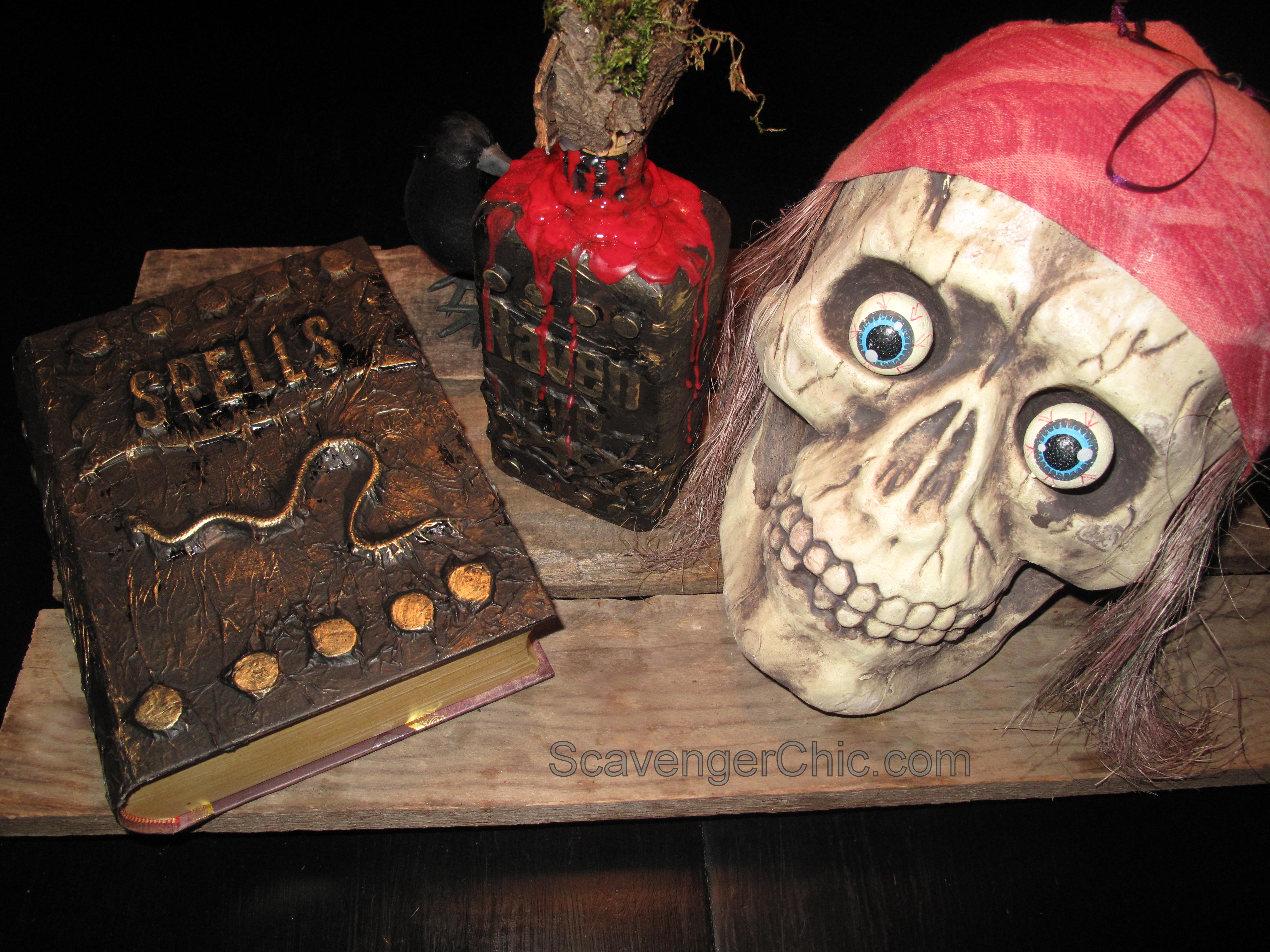 I read both tutorials and had them fresh in mind while I was at Michaels the next day. I round the corner in their Halloween section and find that they too had apothecary jars and Spell books. Now I’m thinking, I just have to make my own…it’s gotta be fate that I’m seeing them everywhere.
