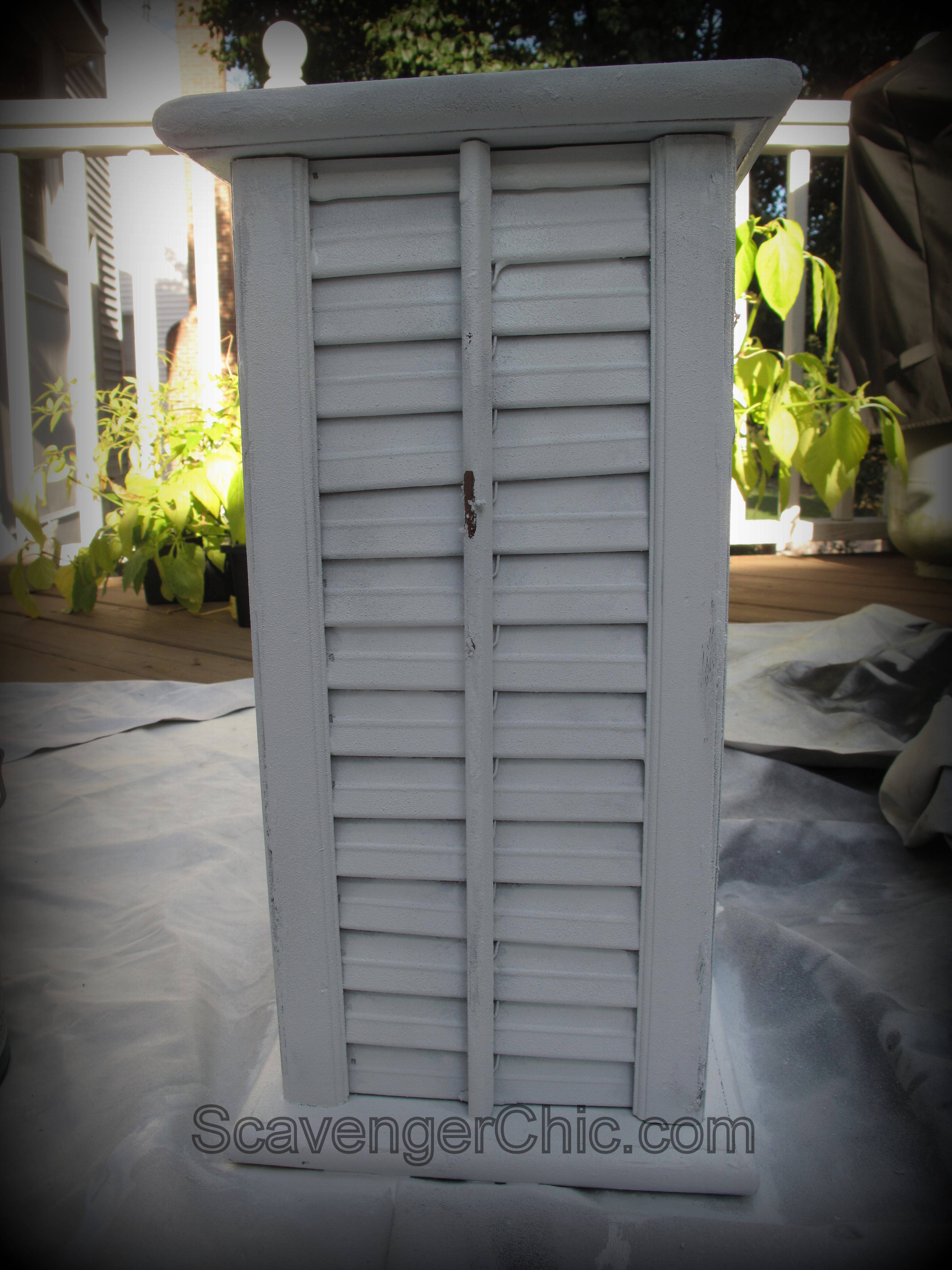 Also in the pile, were these four window shutters. I believe they envisioned them standing up , with a light inside and with the shutter mechanism you could adjust the light dim to dimmer. Cool idea, but I don’t use nightlights that often. When I have a lamp on, I want light and lots of it. What if I could use the shutters as my base for a freestanding lamp? The problem was, they were kind of tall for a lamp, 24 inches. Even my pipe lamp, which I thought was kind of tall, was only 18 inches.