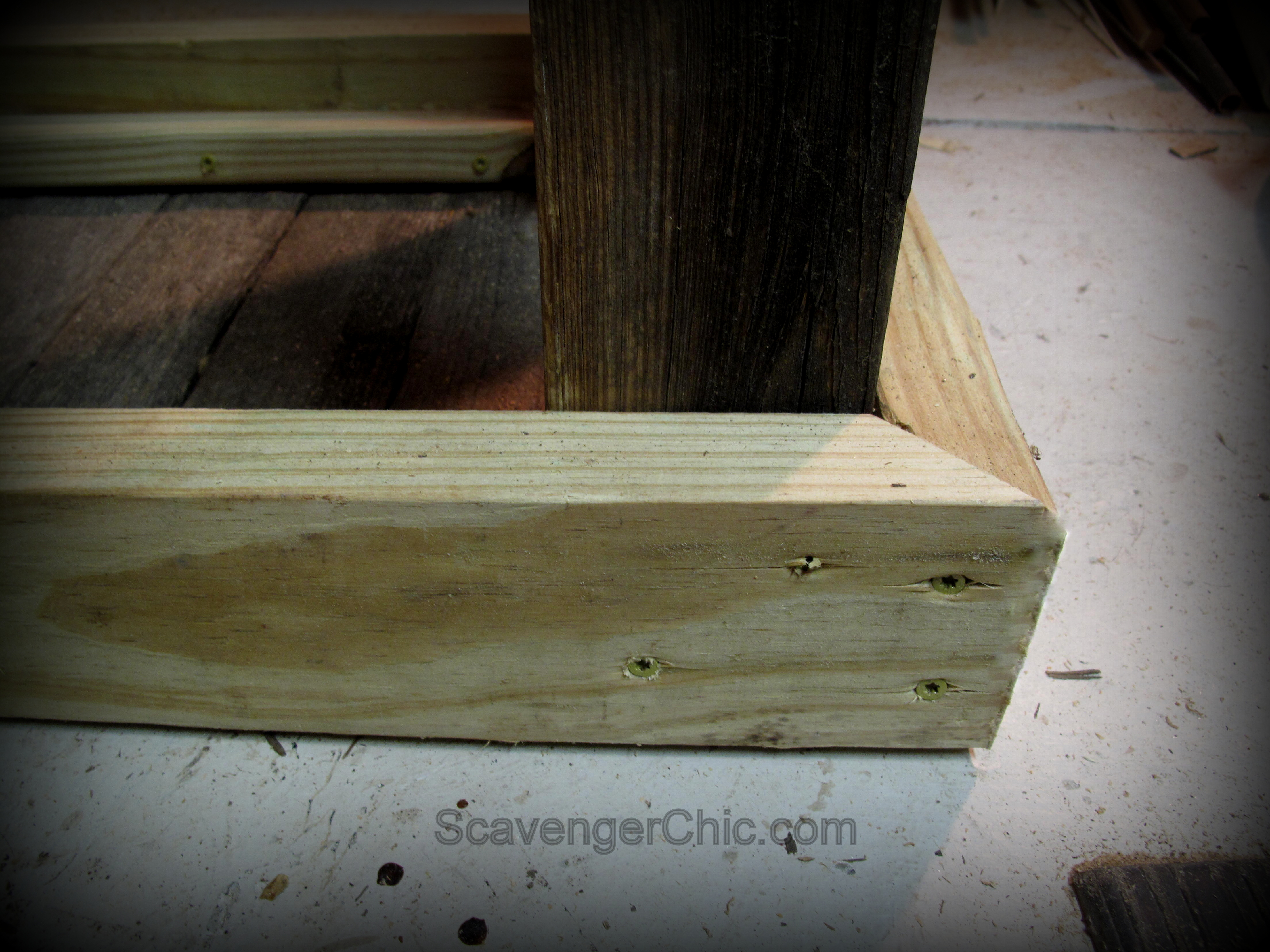 It’s time to start attaching. With the deck screws attach the legs to the frame using at least 4 screws per leg. I used two on each side.
