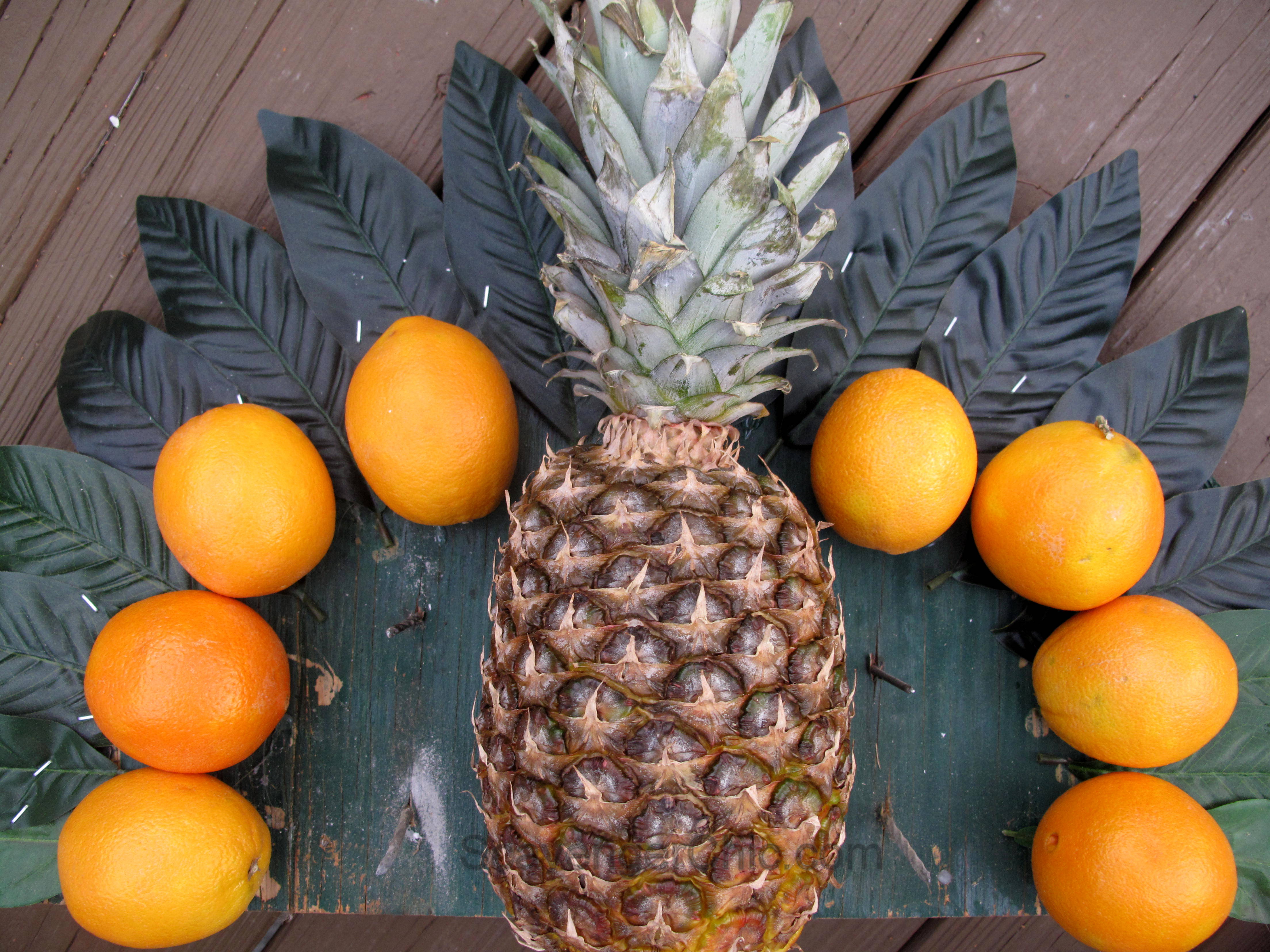 Start with a half circle piece of plywood cut with a jigsaw. (Can you tell mine has been used before?) This one is about 23″ wide by 13″ high. Three inch nails are then inserted in a fan shape around the plywood. If you don’t know how far apart to place the nails, use the fruit as a guide. The four center nails will hold the pineapple securely.
