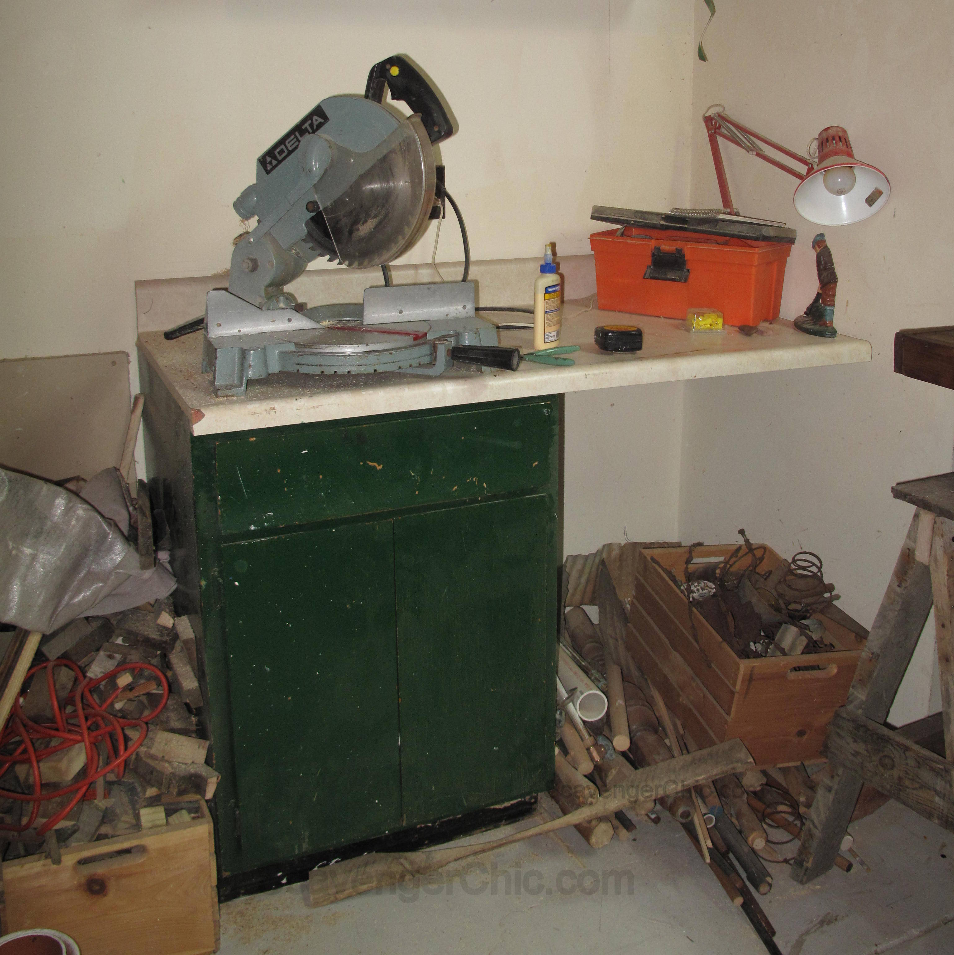 Quite a difference from the before to the after. The bin to the left of the cabinet holds wood scraps from the chop saw.