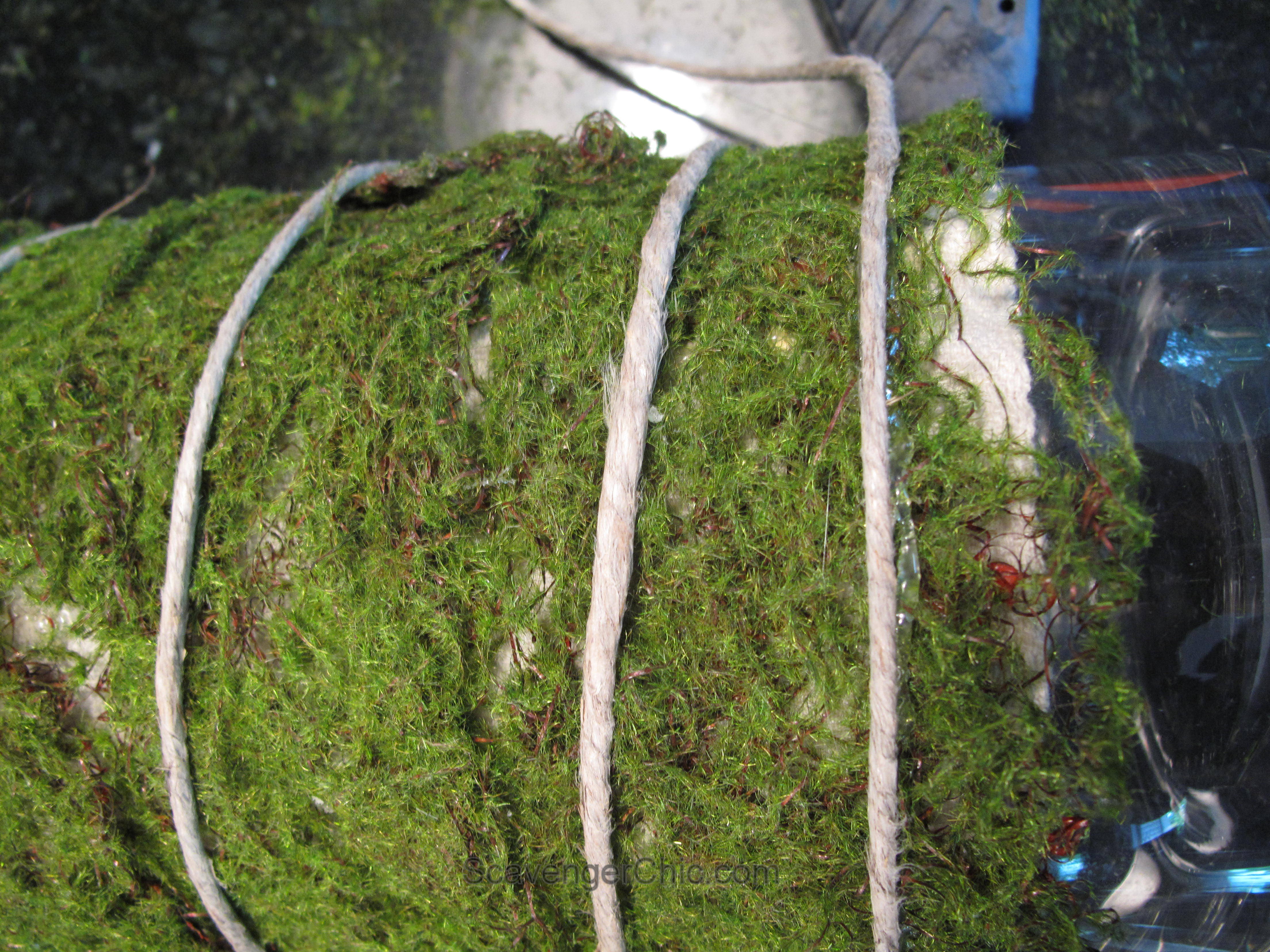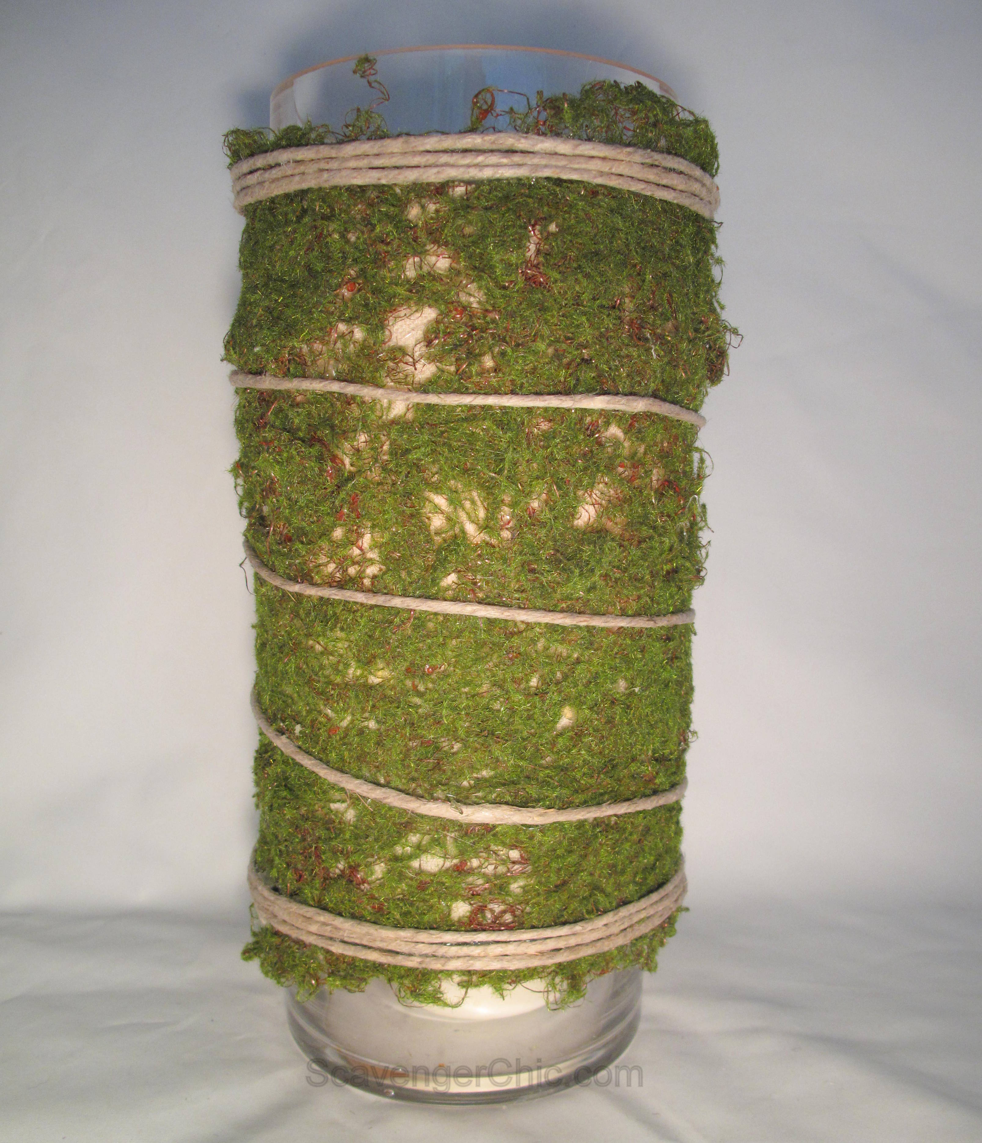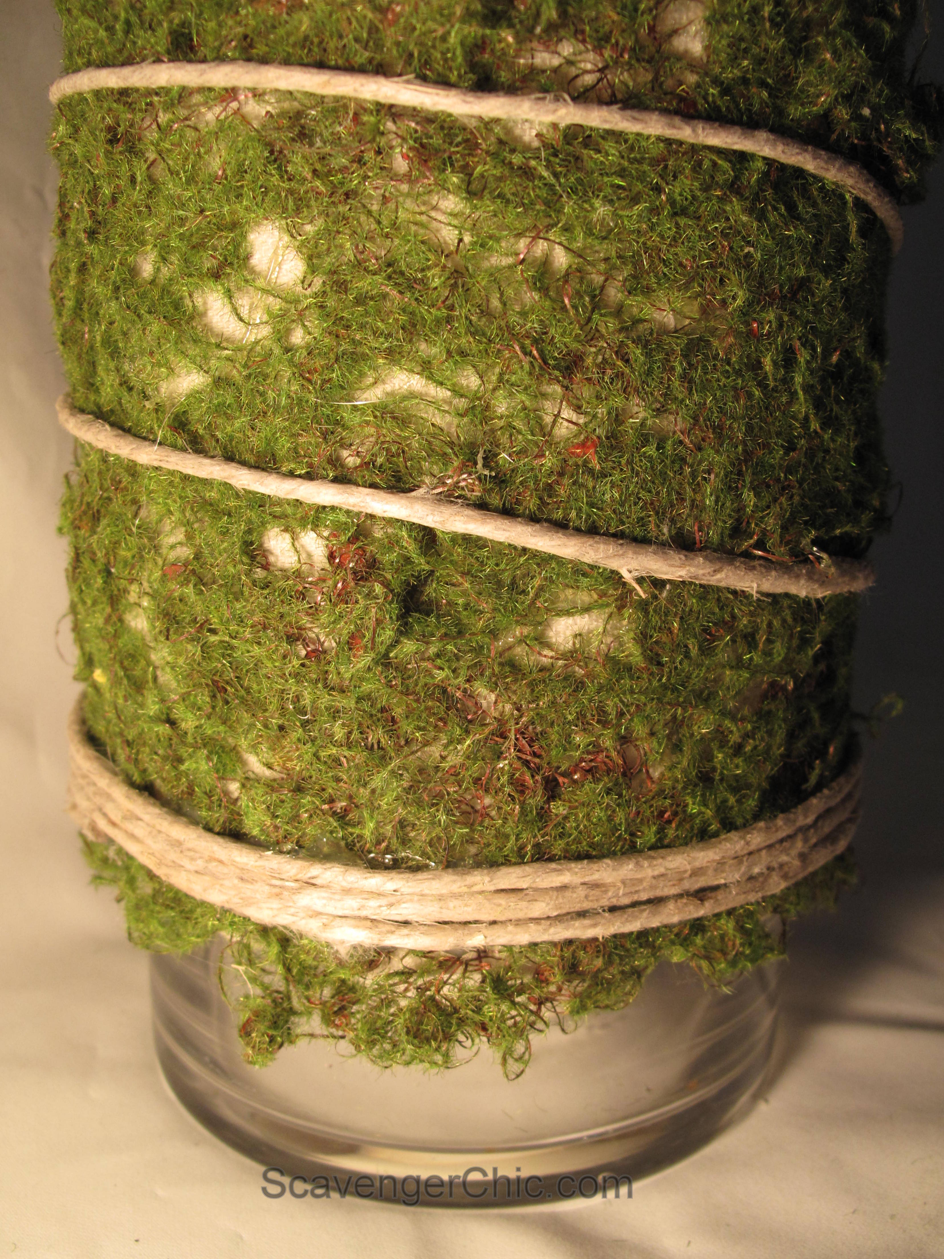 Just like the seashell hurricane lamp, hot glued the top edge of the fabric over first before covering with the moss.